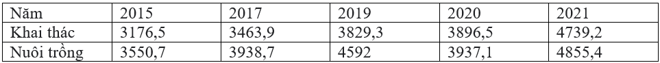 Cho bảng số liệu: SẢN LƯỢNG THỦY SẢN CỦA NƯỚC TA, GIAI ĐOẠN 2015 – 2021 (Đơn vị: Nghìn