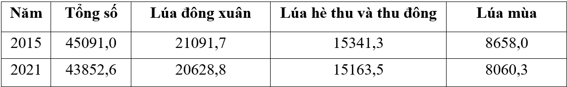Cho bảng số liệu: SẢN LƯỢNG LÚA CỦA NƯỚC TA, NĂM 2015 VÀ 2021 (Nguồn: Niên giám thống kê