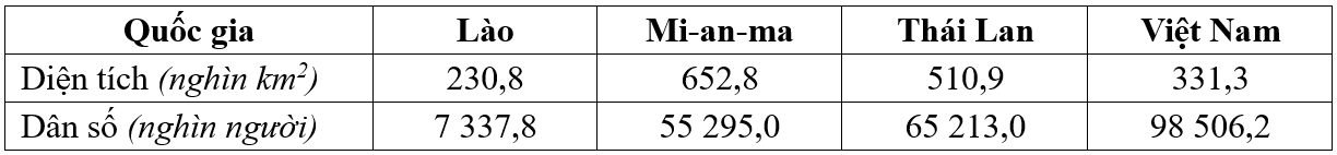 Cho bảng số liệu: DIỆN TÍCH VÀ DÂN SỐ CỦA MỘT SỐ QUỐC GIA ĐÔNG NAM Á NĂM 2021 (Nguồn: Niên
