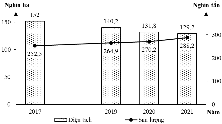 Cho biểu đồ về diện tích và sản lượng hồ tiêu của nước ta, giai đoạn 2017 - 2021: