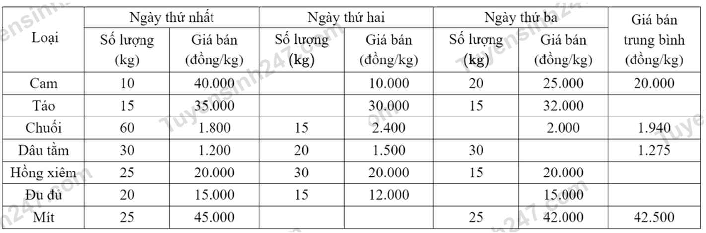 Bảng sau đây thể hiện số liệu bán hàng của một cửa hàng trái cây trong 3 ngày liên tiếp.