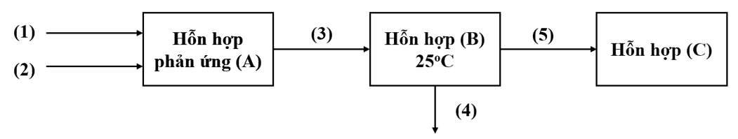 Khí \(CO\) được tổng hợp từ khí thiên nhiên [dòng khí \(C{H_4}\) vào cổng (1) và hơi nước (cổng 2)) trong hỗn hợp phản ứng (A) ở nhiệt độ 200oC và 10 bar. Sau khi phản ứng được hỗn hợp B. Hạ nhiệt độ hỗn hợp (B) về 25oC thu được hỗn hợp khí C (chỉ có \(CO\) và \({H_2}\)). Metanol được tổng hợp trong bình phản ứng (C) ở nhiệt độ 250oC, áp suất 80 – 90 bar và chất xúc tác phù hợp.