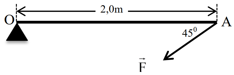 Cho lực \(\overrightarrow F \) tác dụng lên thanh OA có trục quay tại O như hình vẽ. Biết moment của lực \(\overrightarrow F \) đối với trục quay có giá trị 40 N.m. Giá trị của lực \(\overrightarrow F \) bằng