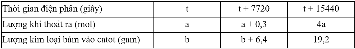 Điện phân dung dịch X gồm các chất Cu(NO3)2, CuSO4 và x gam NaCl với điện cực trơ, có màng ngăn, cường độ dòng điện không đổi 5A. Lượng khí và kim loại thu được trong quá trình điện phân theo thời gian như sau: