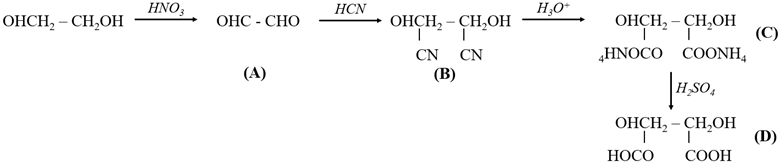 Ethylene glycol $\xrightarrow{{ + CuO({t^o})}}$ (A) $\xrightarrow{{ + HCN}}$ (B) $\xrightarrow{{ + {H_3}{O^ + }}}$ (C) $\xrightarrow{{{H_2}S{O_4}(d,{t^o})}}$ (D)