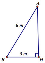 Một cái thang \(AB\) dài \(6m\) tựa vào tường, chân thang cách tường \(3m\). Tính góc tạo bởi thang \(AB\) và tường \(AH\).