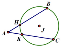 Từ một điểm \(A\) ở ngoài đường tròn \((J)\), kẻ 2 cát tuyến \(AHB\) và \(AKC\). Biết \(\angle