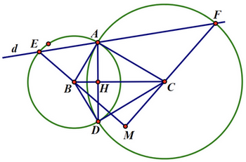 c) Một đường thẳng \(d\) quay quanh \(A\) cắt \((B)\) tại \(E(E \ne A)\) và cắt \((C)\) tại \(F(F \ne A)\). Gọi \(M\) là giao điểm của \(EB\) và \(FC\). Khi \(d\) thay đổi thì điểm \(M\) chạy trên đường nào?