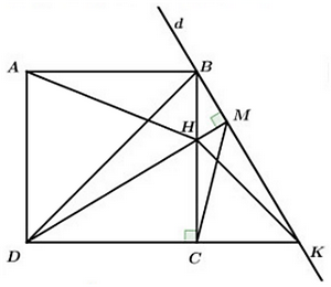 Cho hình vuông \(ABCD\)cạnh \(AB = 16\;{\rm{cm}}\), lấy điểm \(H\) bất kỳ trên cạnh \(BC\) \((H\) khác \(B\) và \(C)\), qua \(B\) kẻ đường thẳng \((d)\) vuông góc với \(DH\) tại \(M\), gọi \(K\) là giao điểm của \(CD\) và \((d)\).