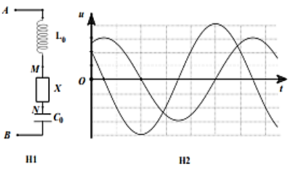 Cho mạch điện xoay chiều gồm cuộn cảm thuần có độ tự cảm L0, thiết bị tiêu thụ điện X và tụ điện có điện dung C0 như hình H1. Đặt điện áp xoay chiều có tần số góc ω vào hai đầu đoạn mạch AB. Đồ thị trên hình H2 là các đường hình sin biểu diễn sự phụ thuộc của các điện áp tức thời \({u_{AN}}\) và \({u_{MB}}\)theo thời gian. Biết \({\omega ^2} = \dfrac{3}{{{L_0}{C_0}}}.\) Gọi kx và k lần lượt là hệ số công suất của thiết bị X và của đoạn mạch AB. Tỉ số \(\dfrac{k}{{{k_X}}}\) có giá trị gần nhất với giá trị nào sau đây?