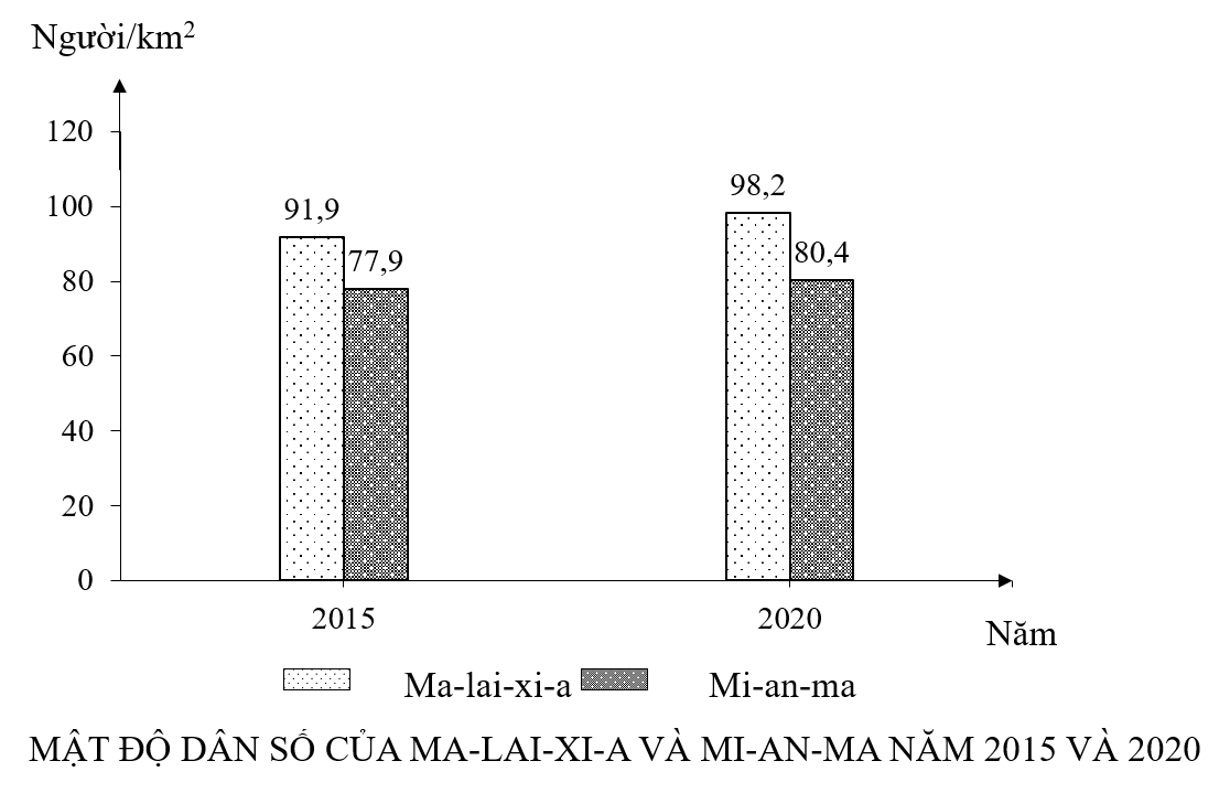 Theo biểu đồ, nhận xét nào sau đây đúng về mật độ dân số của Ma-lai-xi-a và Mi-an-ma năm 2020 so với năm 2015?