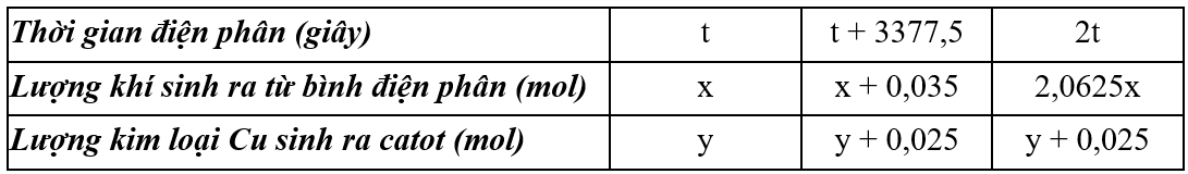 Tiến hành điện phân dung dịch chứa m gam hỗn hợp muối CuSO4 và NaCl bằng dòng điện một chiều có cường độ 2A (với điện cực trơ, có màng ngăn xốp). Kết quả thí nghiệm được ghi trong bảng sau: