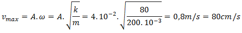 Con lắc lò xo gồm vật nhỏ có khối lượng 200 g và lò xo nhẹ có độ cứng 80 N/m. Con lắc dao động điều hòa theo phương ngang với biên độ 4 cm. Độ lớn vận tốc của vật ở vị trí cân bằng là