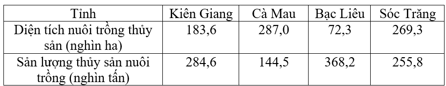 Cho bảng số liệu: DIỆN TÍCH NUÔI TRỒNG THỦY SẢN VÀ SẢN LƯỢNG THỦY SẢN NUÔI TRỒNG MỘT