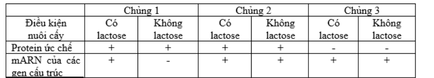 Khi nghiên cứu về hoạt động của Operon Lac ở ba chủng vi khuẩn E.coli người ta thu được bảng kết quả ngắn gọn như sau: