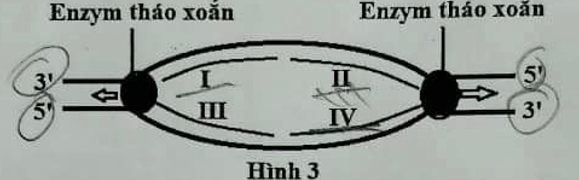 Hình 3 mô tả sơ đồ một đơn vị tái bản (nhân đôi) ADN. Mũi tên chỉ chiều di chuyển của enzim tháo xoắn. Các đoạn I, II, III và IV là các mạch đơn ADN mới được tổng hợp dựa trên mạch khuôn ADN mẹ.