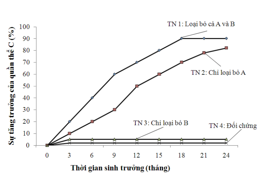 - Thí nghiệm 1 (TN1): Loại bỏ cả 2 quần thể A và quần thể B ra khỏi khu vực quần thể C sinh sống.