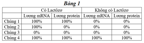 Bảng bên mô tả hàm lượng mARN và protein tương đối của gen Z thuộc operon Lac ở các chủng vi