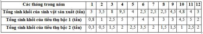 Ở một hệ sinh thái vườn quốc gia có hàm lượng chất khoáng (chất dinh dưỡng) được duy trì ổn định. Nghiên cứu sinh khối của các nhóm sinh vật ở một hệ sinh thái vườn quốc gia, kết quả thu được bảng sau: