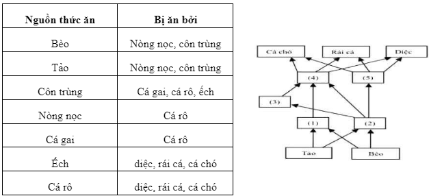 Các mối quan hệ dinh dưỡng trong một con sông được mô tả trong bảng dưới đây. Một lưới thức ăn được thiết lập dựa trên các thông tin trên.