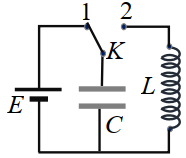 Cho mạch điện như hình vẽ: \(C = 500\,\,pF;L = 0,2\,\,mH\); suất điện động của bộ nguồn E = 1,5 V, lấy \({\pi ^2} = 10\). Tại thời điểm t = 0, khoá K chuyển từ (1) sang (2). Biểu thức của điện tích trên bản tụ điện nối với khóa K theo thời gian là