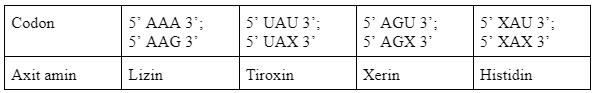 Cho biết các codon mã hóa một số loại axit amin như sau: