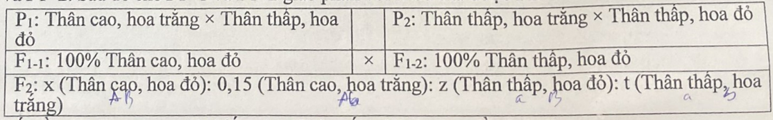 Ở một loài thực vật, tính trạng hoa đỏ trội hoàn toàn so với tính trạng hoa trắng, tính trạng thân cao trội hoàn toàn so với tính trạng thân thấp. Thực hiện phép lai P 1 và P 2, thu được F 1-1 và F 1-2. Sau đó cho F 1-1 và F 1-2 giao phấn với nhau thu được F 2.