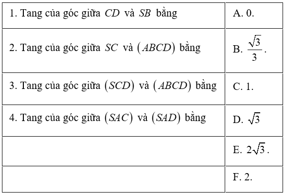 Cho hình chóp \(S.ABCD\) có đáy là hình chữ nhật, \(AB = a,AD = \sqrt 3 a\). Biết \(SA\) vuông góc với mặt phẳng đáy và \(SA = 2\sqrt 3 a\). Ghép nội dung cột bên trái với cột bên phải để được mệnh đề đúng.
