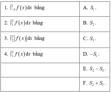 Gọi \({S_1},{S_2},{S_3}\) là diện tích các hình tương ứng trong hình trên. Ghép nội dung cột bên trái với cột bên phải để được mệnh đề đúng.