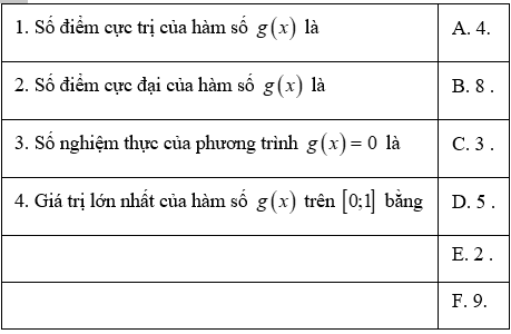 Xét hàm số \(g\left( x \right) = f\left( {2f\left( x \right) - 1} \right)\). Ghép nội dung cột bên trái với cột bên phải để được mệnh đề đúng.
