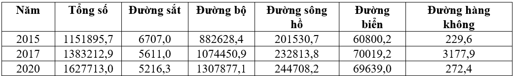 Cho bảng số liệu: KHỐI LƯỢNG HÀNG HÓA VẬN CHUYỂN, PHÂN THEO NGÀNH VẬN TẢI CỦA NƯỚC TA, GIAI