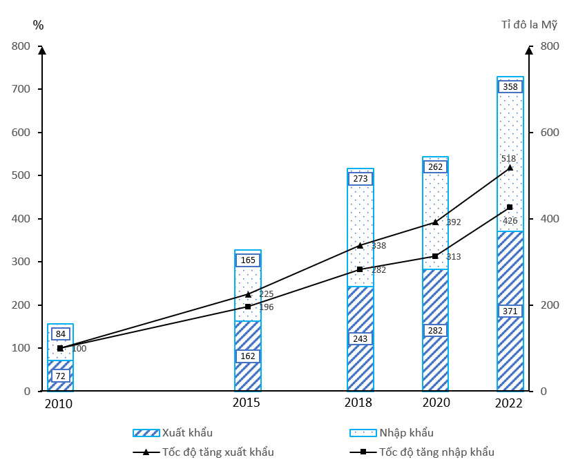 Cho biểu đồ về xuất, nhập khẩu của nước ta giai đoạn 2010 - 2022 (Nguồn: Niên giám thống