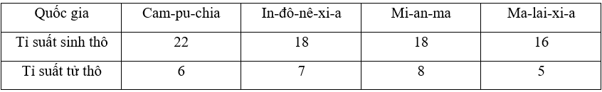 Cho bảng số liệu: TỈ SUẤT SINH THỔ VÀ TỈ SUẤT TỬ THÔ CỦA MỘT SỐ QUỐC GIA NĂM 2020 (Đơn