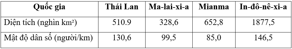 Cho bảng số liệu: DIỆN TÍCH VÀ MẬT ĐỘ DÂN SỐ CỦA MỘT SỐ QUỐC GIA NĂM 2021 (Nguồn: Theo