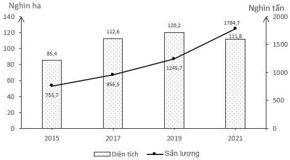 Cho biểu đồ về diện tích và sản lượng cam, quýt của nước ta, giai đoạn 2015 - 2021: