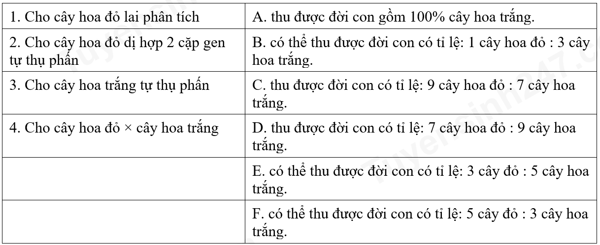 Cho biết tính trạng màu hoa do 2 cặp gen (A,a; B,b) phân li độc lập cùng quy định. Kiểu gen có cả 2 loại alen trội quy định hoa đỏ, các kiểu gen còn lại quy định hoa trắng. Ghép nội dung ở cột bên phải với nội dung ở cột bên trái để trở thành một câu có nội dung đúng về sự di truyền của tính trạng trên: