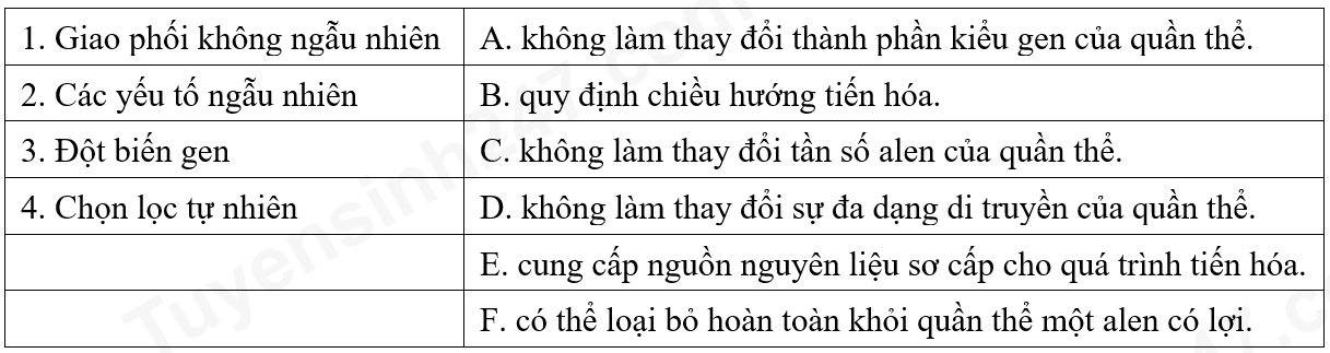 Ghép nội dung ở cột bên phải với nội dung ở cột bên trái để trở thành một câu có nội dung đúng về các nhân tố tiến hóa: