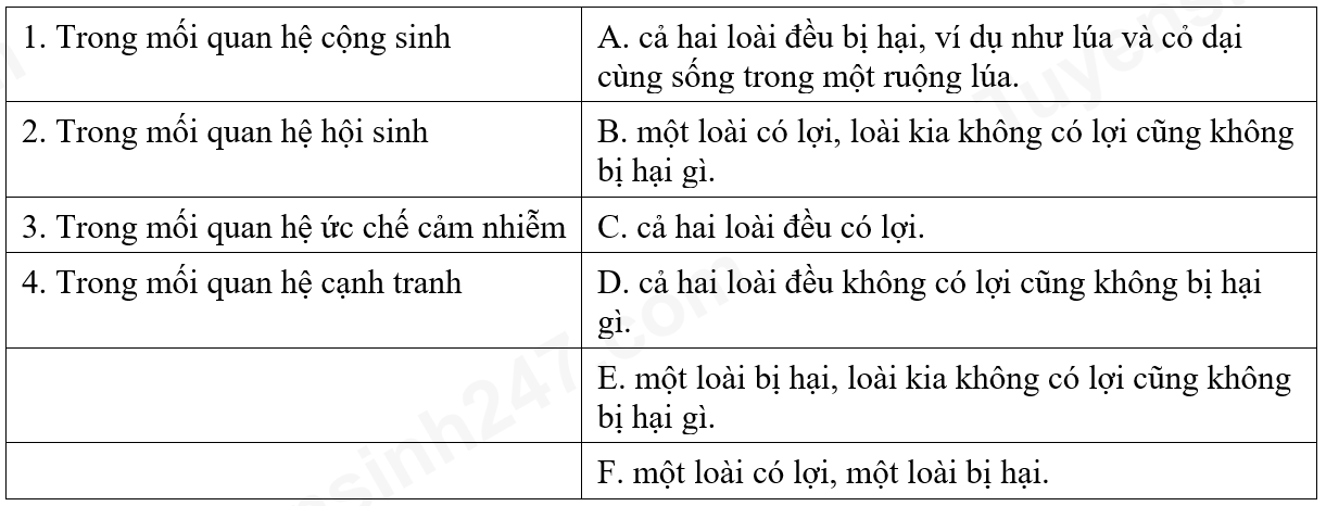 Ghép nội dung ở cột bên phải với nội dung ở cột bên trái để trở thành một câu có nội dung đúng về quan hệ giữa hai loài trong quần xã sinh vật: