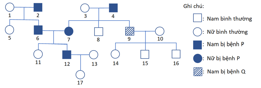 Phả hệ sau mô tả sự di truyền bệnh P và bệnh Q ở người. Biết rằng mỗi bệnh do một gen quy định, gen quy định bệnh Q nằm ở vùng không tương đồng của NST giới tính X.