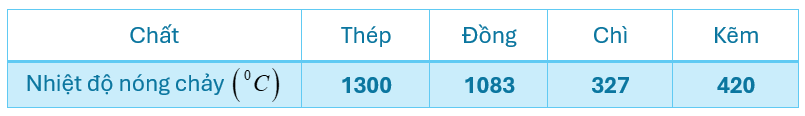 Cho nhiệt độ nóng chảy của một số chất như bảng. Khi thả một thỏi thép và một thỏi kẽm vào đồng đang nóng chảy. Thỏi nào nóng chảy theo đồng?
