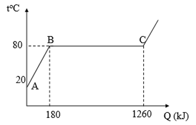 Cho đồ thị biểu diễn sự thay đổi nhiệt độ của khối chất lỏng theo nhiệt lượng cung cấp có dạng hình bên. Biết khối lượng của chất lỏng là 1,2kg. Nhiệt hoá hơi riêng của chất lỏng này là bao nhiêu?