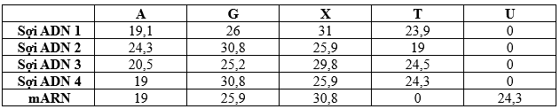 Bảng dưới đây là kết quả phân tích thành phần phần trăm (%) các loại nucleotit của bốn sợi