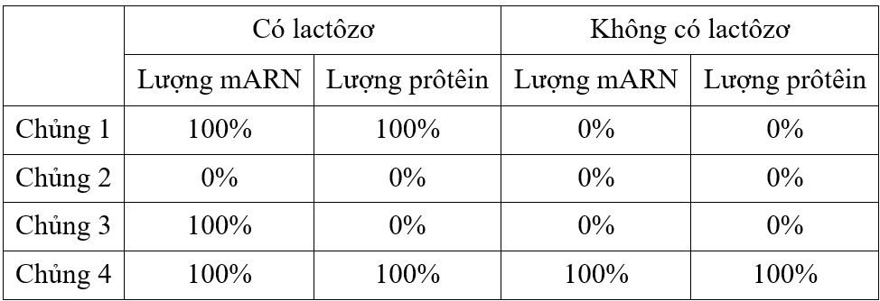 Bảng dưới đây mô tả hàm lượng mARN và prôtêin tương đối của gen Y thuộc opêron Lac ở các chủng vi khuẩn E. coli trong môi trường có hoặc không có lactôzơ.
