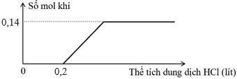 Dung dịch X chứa Ba(HCO3)2 0,5M và NaHCO3 xM. Dung dịch Y thu được khi hấp thụ hết 0,05 mol CO2 vào dung dịch chứa y mol NaOH. Trộn X và Y thu được 9,85 gam kết tủa và 300 ml dung dịch Z. Nhỏ từ từ từng giọt dung dịch HCl 1M vào 300ml Z, sự phụ thuộc số mol khí vào thể tích dung dịch HCl được mô tả như đồ thị hình sau. Coi thể tích của dung dịch không đổi.