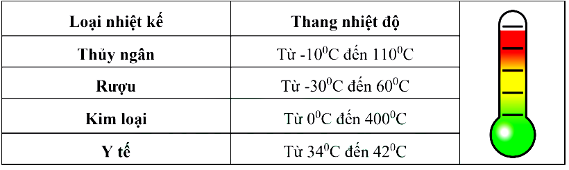 Bảng dưới đây ghi tên các loại nhiệt kế và nhiệt độ ghi trên thang đo của chúng?