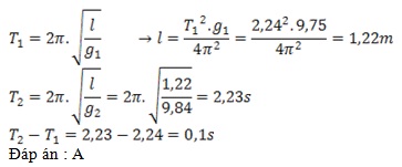Con lắc đơn dđđh ở nơi có gia tốc trọng trường là 9,75m/s2 thì có T = 2,24s. Coi l không thay
