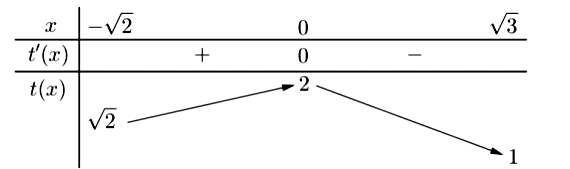 Đặt \(t = \sqrt {4 - {x^2}} \Rightarrow t'(x) = \dfrac{{ - x}}{{\sqrt {4 - {x^2}} }}{\rm{.}}\). Sau đó lập bảng biến thiên của hàm \(f\left( t \right)\)