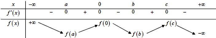 Cho hàm số \(y = f\left( x \right)\). Hàm số \(y = f'\left( x \right)\) có đồ thị như hình vẽ. Biết phương trình \(f'\left( x \right) = 0\) có bốn nghiệm phân biệt \(a,0,b,c\) với \(a < 0 < b < c\). Mệnh đề nào sau đây đúng ?