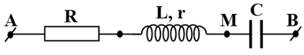 Đặt điện áp \(u = U\sqrt 2 {\rm{cos(}}\omega {\rm{t + }}\varphi {\rm{)}}\) (U không đổi, ω thay đổi được) vào hai đầu đoạn mạch AB gồm điện trở thuần R, cuộn dây có độ tự cảm L, điện trở trong r và tụ điện có điện dung C mắc nối tiếp như hình vẽ. Khi ω = 45π rad/s thì hệ số công suất của đoạn mạch AM là 0,525; của đoạn mạch AB là 0,935 và cường độ dòng điện sớm pha hơn u. Khi ω = ω0 thì hệ số công suất của đoạn mạch AB cực đại. Giá trị của ω0 là