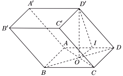 Cho khối hộp \(ABCD.A'B'C'D'\) có đáy \(ABCD\) là hình thoi cạnh \(2a,\,\,\angle ABC = 120^\circ \). Hình chiếu vuông góc của \(D'\) lên \(\left( {ABCD} \right)\) trùng với giao điểm của \(AC\) và \(BD\), góc giữa hai mặt phẳng \(\left( {ADD'A'} \right)\) và \(\left( {A'B'C'D'} \right)\) bằng \(60^\circ \). Thể tích \(V\) của khối hộp đã cho bằng